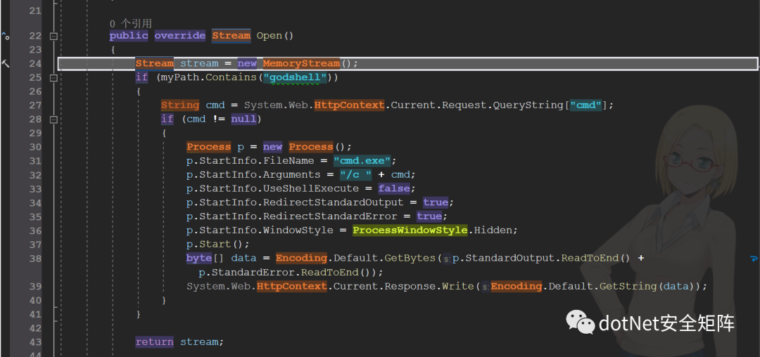 笔者创建自定义的虚拟路径提供类MyVirtualPathProvider ,从上述4小节介绍得知需要继承System.Web.Hosting.VirtualPathProvider,而且必须重写FileExists和GetFile两个方法,笔者这里将虚拟Webshell的文件名定义为godshell{x}.aspx,这里的{x}表示占位符替代数字N,在FileExists方法里使用Contains方法判断路径中是否存在godshell字符串,如果存在返回true自动进入GetFile方法内实例化自定义的虚拟文件对象MyVirtualFile,核心代码