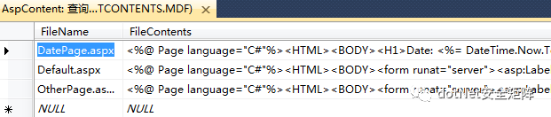 很多场景下实现页面或文件隐藏一般都继承自IHttpHandler或IHttpModule这两个HTTP请求生命周期范围内的核心接口,并在web.config文件中配置映射的扩展和注册的程序集,与之相比VirtualPathProvider更为强大。具体的适用场景如在某些特殊的情况下网站常规的文件、目录编排方式不能满足要求,可以把网站文件名和文件内容代码保存到数据库中,然后将这些数据库里的数据通过虚拟化技术编译生成可访问的HTTP地址,这些类通常定义在System.Web.Hosting命名空间内,如本文介绍的VirtualFile类及下节课程将要介绍的VirtualDirectory类,更为了更好的理解 VirtualPathProvider 类使用的实际场景,如下笔者在本地 SQL Server 上有一个如下图所示的数据库表,里面保存了3个页面,可以看到表里有一个文件名和aspx文件代码的内容。