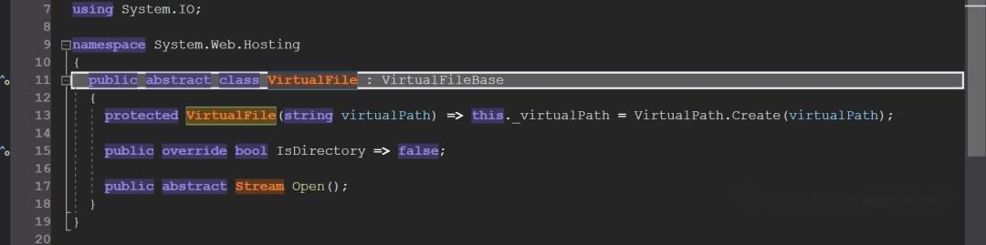 public virtual bool FileExists(string virtualPath) => this._previous != null && this._previous.FileExists(virtualPath);public virtual VirtualFile GetFile(string virtualPath) => this._previous == null ? (VirtualFile) null : this._previous.GetFile(virtualPath);GetFile返回的是一个VirtualFile对象,此对象和VirtualPathProvider一样都是抽象的所以还需要自定义一个类去实现它,重写此抽象类里的Open方法实现数据保存到内存 MemoryStream,然后返回这个流,使用这个流读取内容,就好像读取物理盘符下的文件一样。