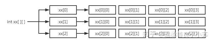 int[][] arr=new int[3][4];上面的代码相当于定义了一个3*4的二维数组,这个二维数组的长度为3,我们可以将它看成3个int[]类型的一维数组,每个一维数组中的元素又是一个长度为4的一维数组。接下来通过一个图来表示这种情况,如下图所示。