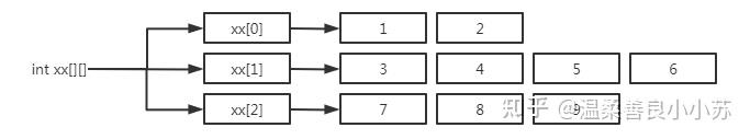 上面的二维数组定义了三个元素,这三个元素都是数组,分别为{1,2}、{3,4,5,6}、{7,8,9},接下来通过下图来表示这种情况: