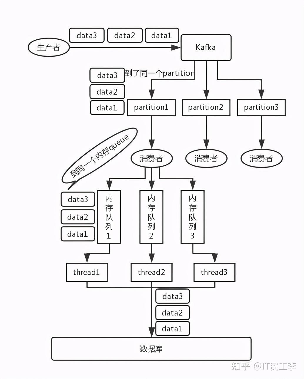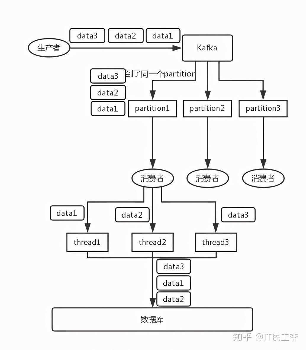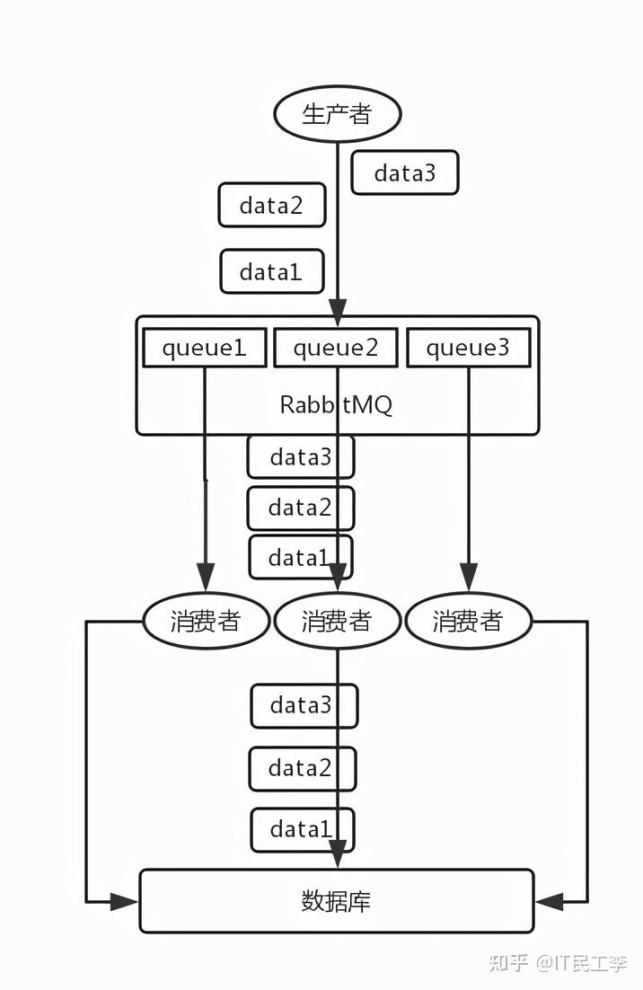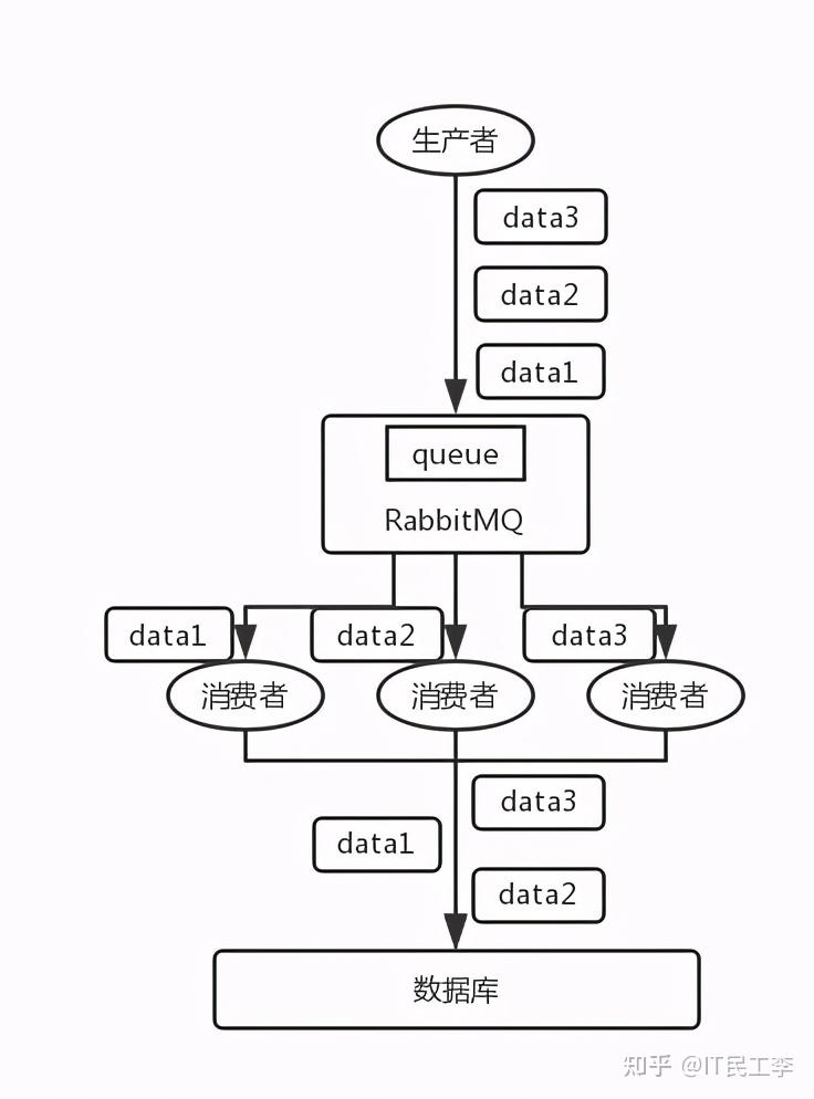 - RabbitMQ:一个 queue,多个 consumer。比如,生产者向 RabbitMQ 里发送了三条数据,顺序依次是 data1/data2/data3,压入的是 RabbitMQ 的一个内存队列。有三个消费者分别从 MQ 中消费这三条数据中的一条,结果消费者2先执行完操作,把 data2 存入数据库,然后是 data1/data3。这不明显乱了。