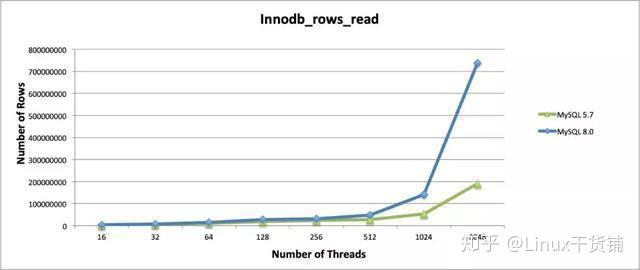 有趣的是,MySQL团队关于新版本中读写性能的声明,这些图表指出了性能的显著提高,特别是在高负载服务器上。想一下MySQL 5.7和MySQL 8.0在InnoDB行操作上的区别,确实存在有很大的不同,特别是当线程数增加的时候。MySQL 8.0表明,无论工作负载如何,它都能高效地运行。