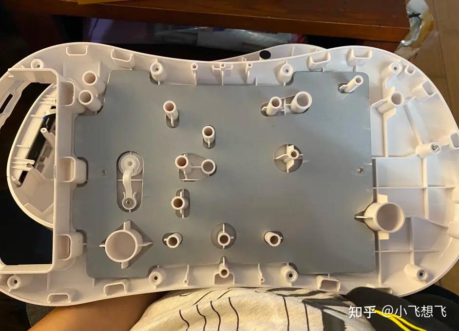 把橡胶塞拔出,并将10个螺丝拧开,摇杆可以轻松拆开,这里仔细观察可以看出胶塞设计贴合整机边缘的倒角角度,但是工人在安装的时候比较随意,有几个装错了