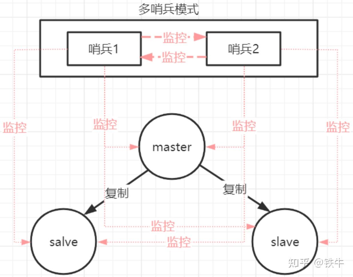 • 哨兵通过 PING 命令检测它和从库、主库之间的连接情况,如果发现响应超时就会认为服务已下线。但会存在误判,如果误判的节点是从,影响不大,拿掉一个从节点,对整体影响不大;如果误判主节点,影响就很大了。