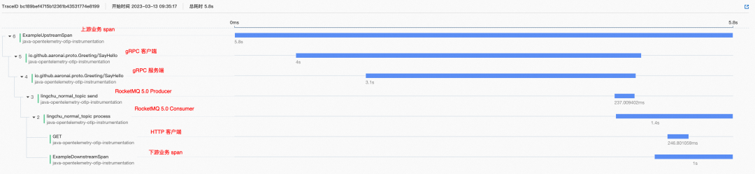 RocketMQ 5.0 PushConsumer 在收到消息之后,也会在 MessageListener 里执行其他的业务操作,也会有对应的 span,我们称之为 ExampleDownstreamSpan。那么默认在 receive span 没有启用的情况下,按照开始时间的顺序,会先后存在 7 个 span。分别是: