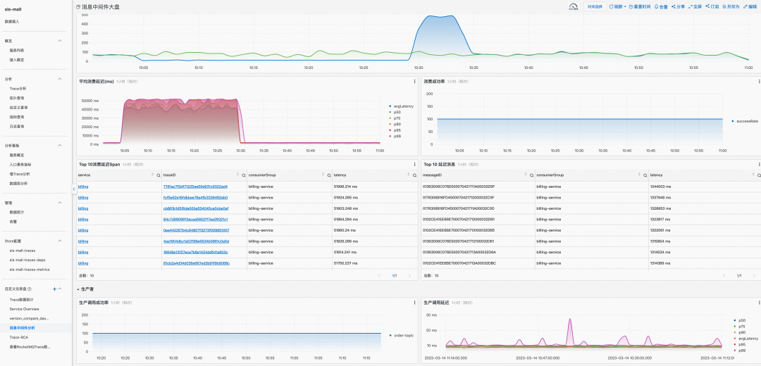 除此之外,SLS Trace 服务的 demo 页也提供了基于 RocketMQ 5.0 定制的消息中间件大盘,生动展示了利用 Trace 数据得到的发送成功率,端到端延时等一系列指标。