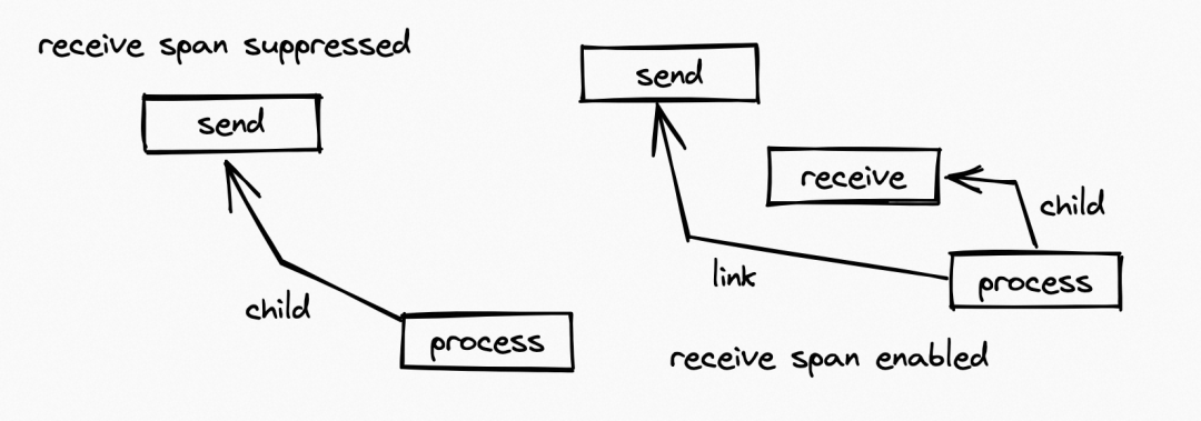 在没有启用 receive span 的情况下,process span 会作为 send span 的 child;而当 receive span 启用的情况下,process span 会作为 receive span 的 child,同时 link 到 send span。