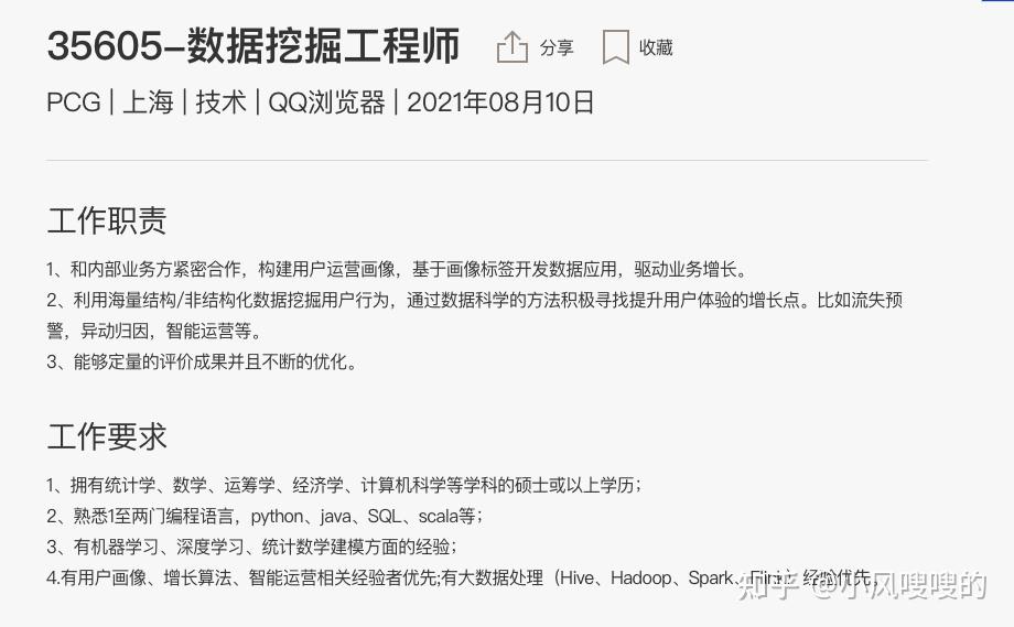 简单来说“数据挖掘”是“数据分析”的前置,而数据分析需要的编程和机器学习的成分⽐较低,但更需要对于业务、商务的理解。下图是腾讯某数据挖掘工程师和数据分析师的区别: