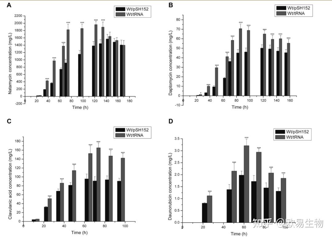 图3 |  tRNA-Asp-AUC 的表达增强了商业抗生素的生物合成