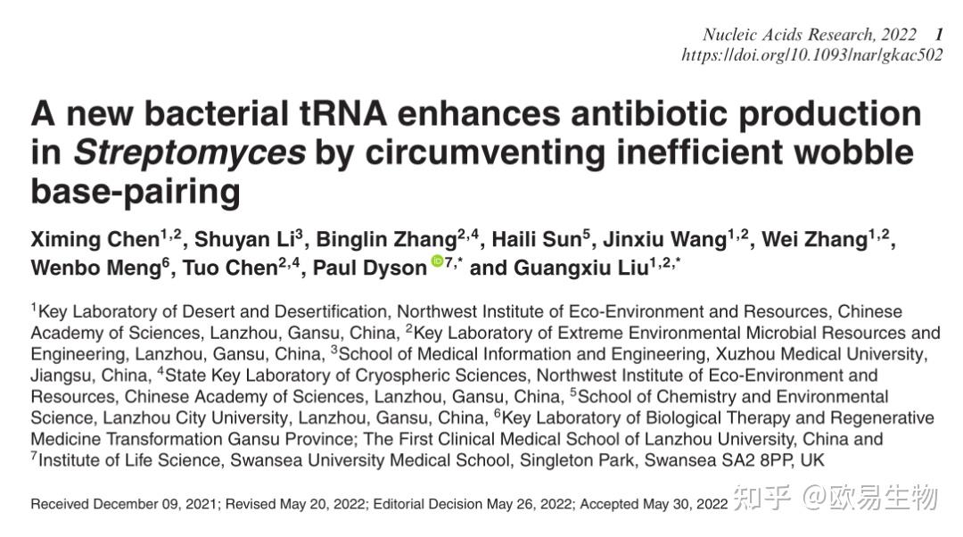 2022年5月,中国科学院西北生态环境资源研究院刘光琇研究团队(一作:陈熙明副研究员)Nucleic Acids Research期刊(IF:19.16)发表的题为 “A new bacterial tRNA enhances antibiotic production in Streptomycesby circumventing inefficient wobble base-pairing ”的研究成果,发现了一种新型tRNA,并通过iTRAQ蛋白质组学方法证实其提高链霉菌抗生素产量效果,为增产抗生素的生物路径探索提供了理论依据。中科院沙漠与沙漠化重点实验室、甘肃省极端环境微生物资源与工程重点实验室陈熙明副研究员为第一作者,刘光琇研究员与英国Swansea大学Paul Dyson教授为共同通讯作者。