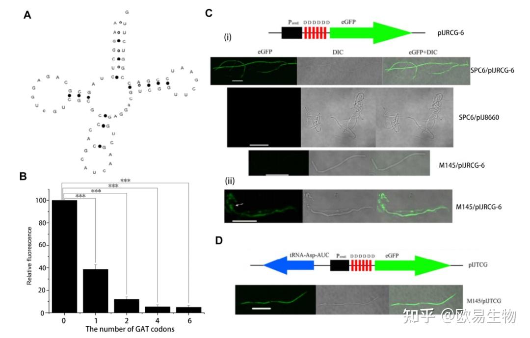 作者还用6个GAT密码子在天蓝色链球菌菌株中表达修饰的 eGFP 基因,该菌株也表达 tRNA-Asp-AUC,其天然启动子整合到染色体中。在该菌株中观察到荧光营养菌丝,表明 eGFP mRNA 在早期生长阶段的有效翻译(图1D),结果证实了在没有同源 tRNA 的情况下,依赖于摆动碱基配对的 GAU 密码子的翻译在营养生长期间效率低下。这些实验证实了预测的 tRNA-Asp-AUC 确实有效地解码了 GAT 密码子。