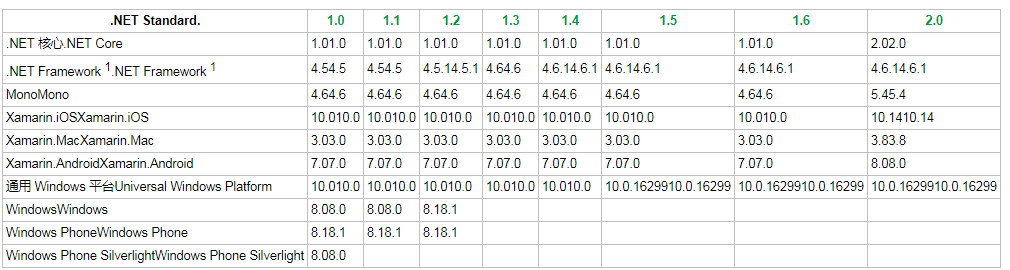 微软给出了一个各个常见平台各个版本所支持的 .NET Standard 标准的列表。