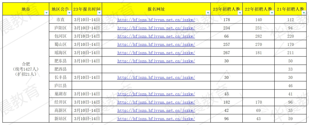 合肥市11个地区共招聘1427人,小学841人,初中361人,高中223人,特殊教育2人。目前扩招21人。(庐江不参加统考,肥西暂未发布不定)