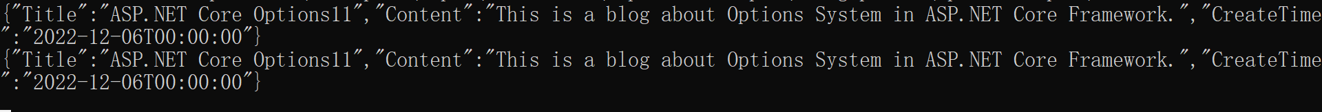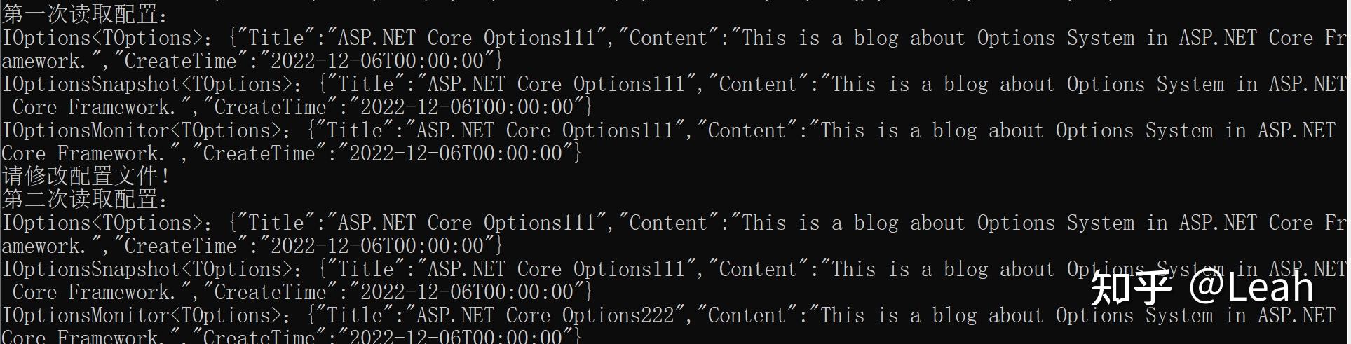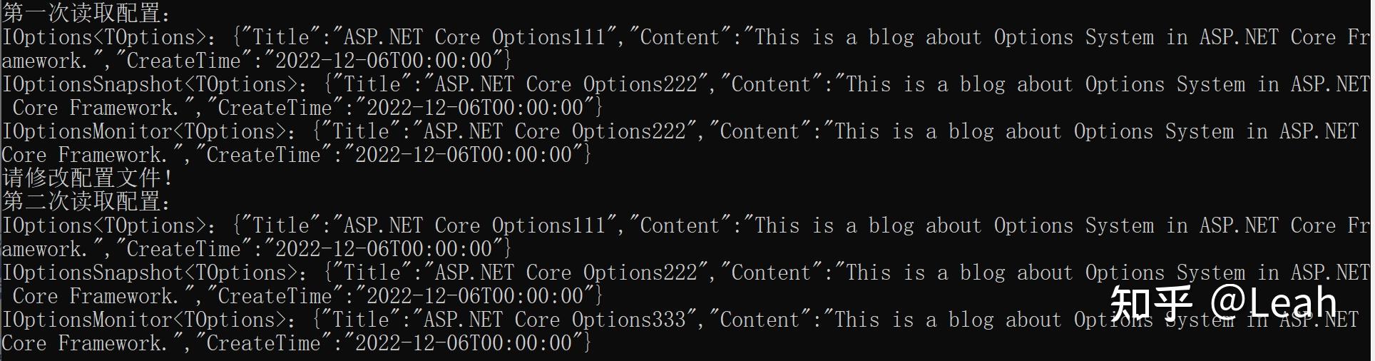}可以看到控制台的输出中,第二次读取配置的时候,IOptionsMonitor 接口读取到的内容已经改变