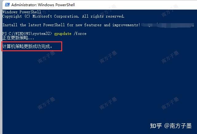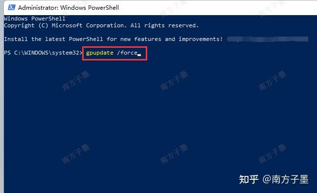 在管理员模式的Windows Powershell 窗口中,输入gpupdate /force,进行强制更新组策略