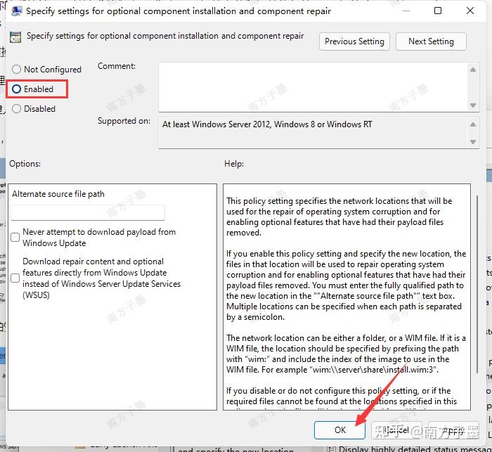 在打开的【指定可选组件安装和组件修复的设置】界面中,选中【Enabled】已启用,