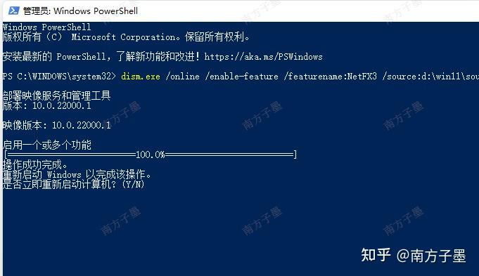 这个过程只需要几秒钟时间,当提示操作成功完成时,输入【Y】,电脑会马上自动重启,不能取消的哦!所以一定要在其它操作已经完成,编辑的文件已经做好保存时,再进行哦!重启,系统更新完成后,.NET Framework 3.5就安装好了。这张配图是更新系统之后补上的,所以语言和版本都不一样了,特别说明一下。