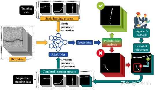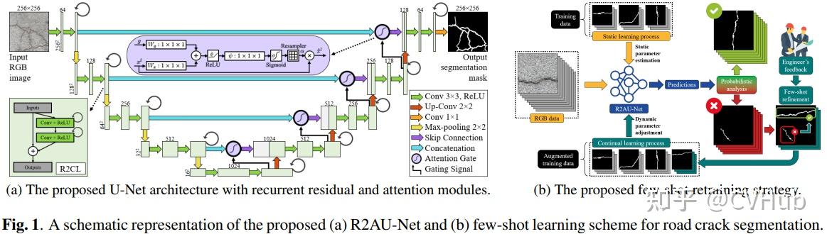 为更好的动态适应用户反馈,本文主要探讨了一种关于小样本语义分割的道路裂缝自动分割算法,其基于具有循环残差和注意力模块的U-Net架构——Recurrent Residual and Attention U-Net。当一些新的校正样本被送入分类器时,采用再训练策略可以动态地微调U-Net的权重。大量实验表明,在名为CrackMap的新数据集上,所提出的小样本R2AU-Net框架在Dice和IoU指标方面优于其他最先进的网络,