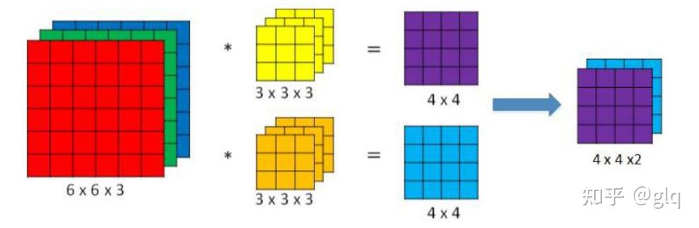 卷积操作的实现可以使用滑动窗口的方式,即在输入图像上滑动一个卷积核,将卷积核和输入图像对应位置的像素值相乘并求和,得到输出图像中对应位置的像素值。对于多通道卷积,卷积核的通道数需要与输入数据的通道数相同,每个卷积核的每个通道都会与输入数据的相应通道进行卷积操作。在每次卷积操作中,卷积核会滑动到输入数据上的不同位置,与当前位置的数据进行卷积计算,得到一个输出值。例如在图2中输入图像尺寸为6\times6\times3 ,通道数为3,卷积核有两个,每个尺寸为3\times3\times3,通道数为3(与输入图像通道数一致),卷积时,仍是以滑动窗口的形式,从左至右,从上至下,3个通道的对应位置相乘求和,输出结果为 4\times4\times2 的特征图。