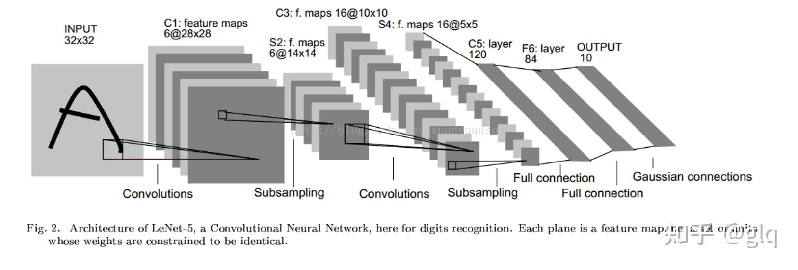 LeNet-5的基本结构包括7层网络结构(不含输入层),其中包括2个卷积层、2个降采样层(池化层)、2个全连接层和输出层。