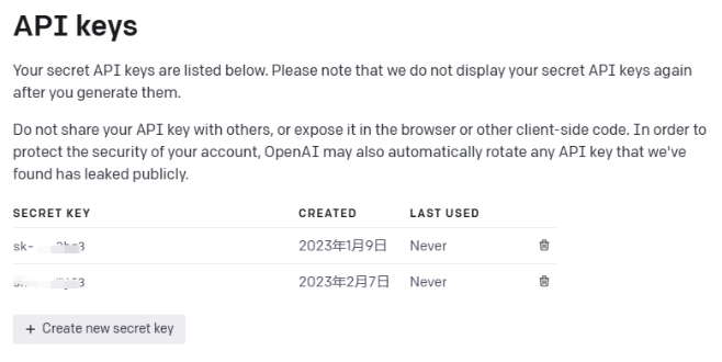 注册成功后登录ChatGPT官网,在右上角点击"Personal",然后打开下拉菜单中的"View API keys",最后点击页面中的"Create new secret key"创建key,需要注意的是弹出窗口时复制一下,一旦创建将看不见key,只能删除重新创建。如下图1,图2。