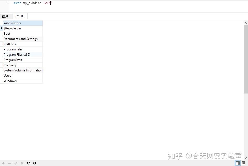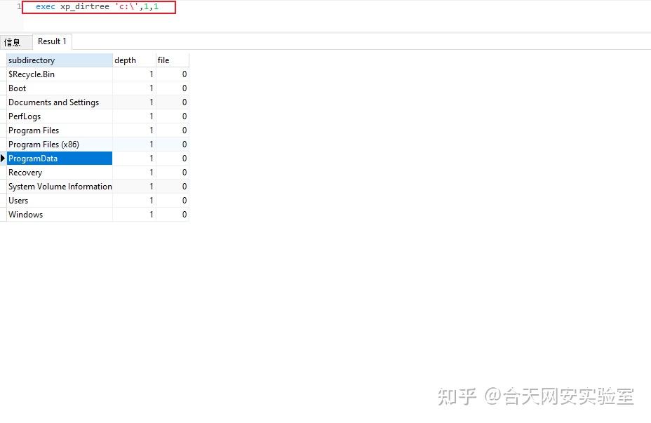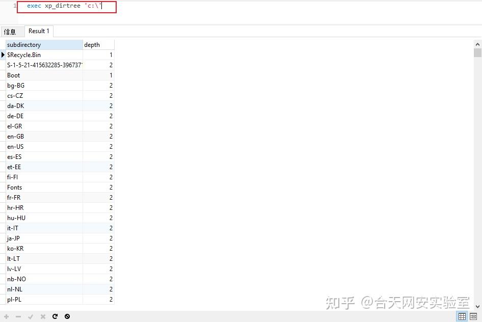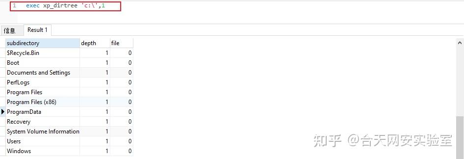 execute master..xp_dirtree 'c:',1,1 --列c:\目录、文件当实际利用的时候我们可以创建一个临时表把存储过程查询到的路径插入到临时表中