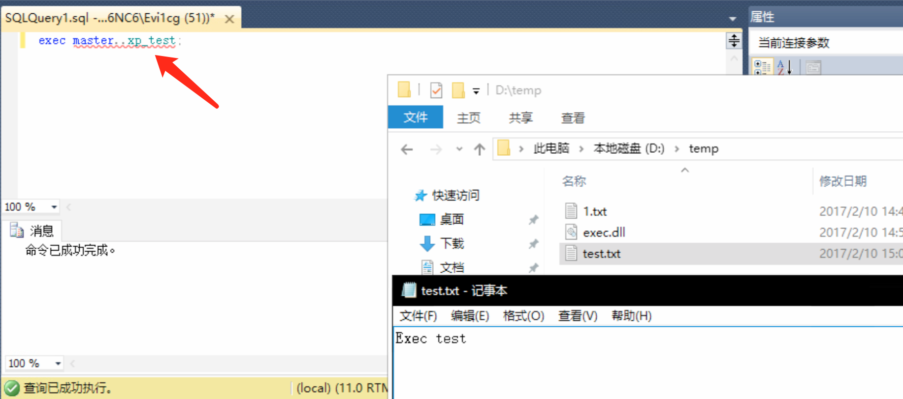 导入之后的可调用xp_test来执行命令: