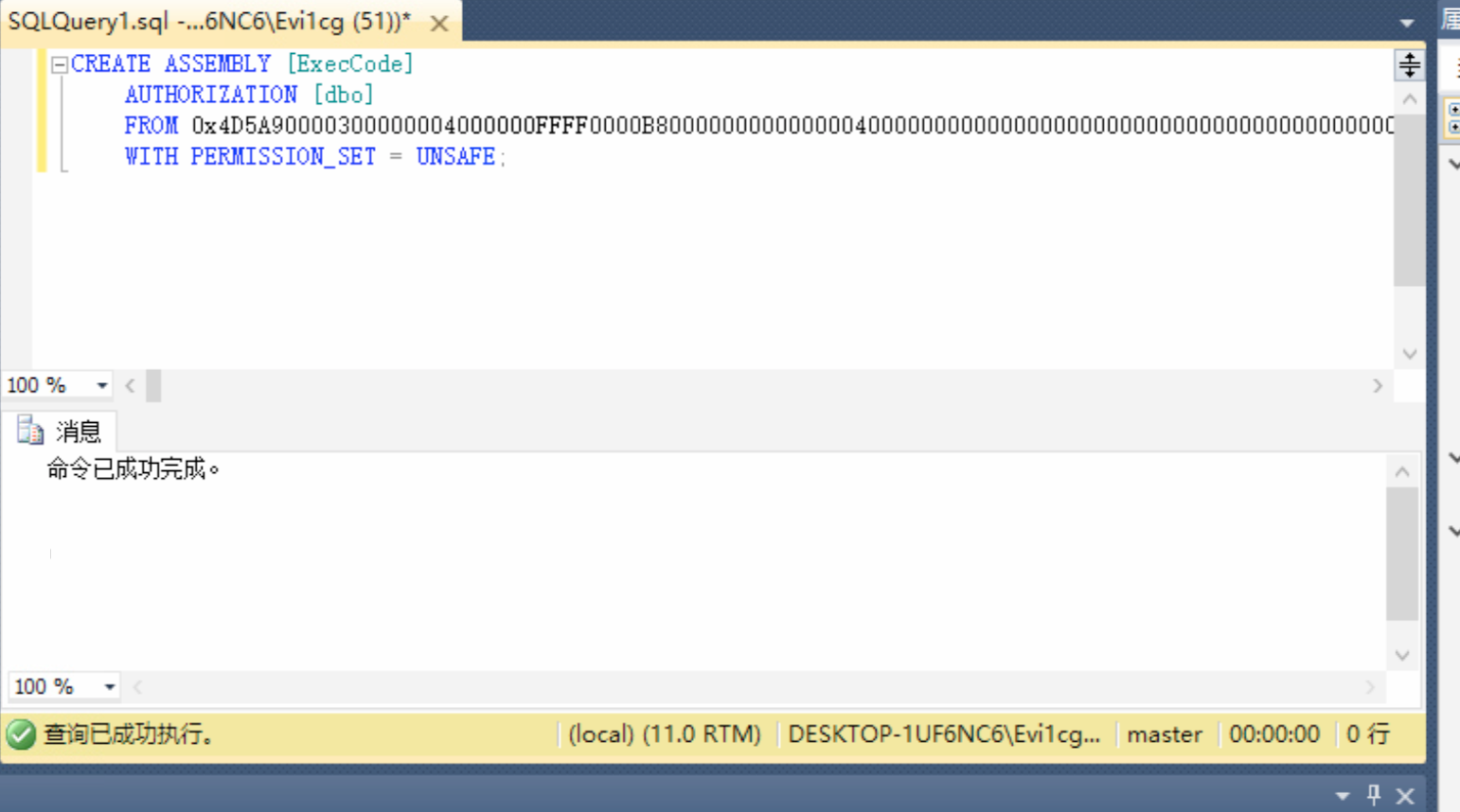 CREATE ASSEMBLY AssemblyName from 文件十六进制流对于做渗透的我们,当然是没有文件是最好的方式了,因此,本文主要介绍方式二。以下为详细测试步骤: