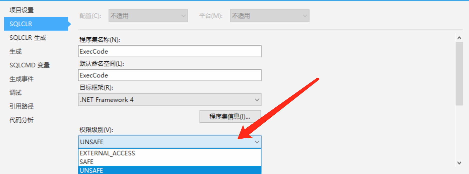 3、设置项目属性,目标平台修改为需要的目标平台,如SQL Server 2012; 将SQLCLR权限级别修改为UNSAFE;修改.Net 框架版本为自己需要的版本;语言选择C#。