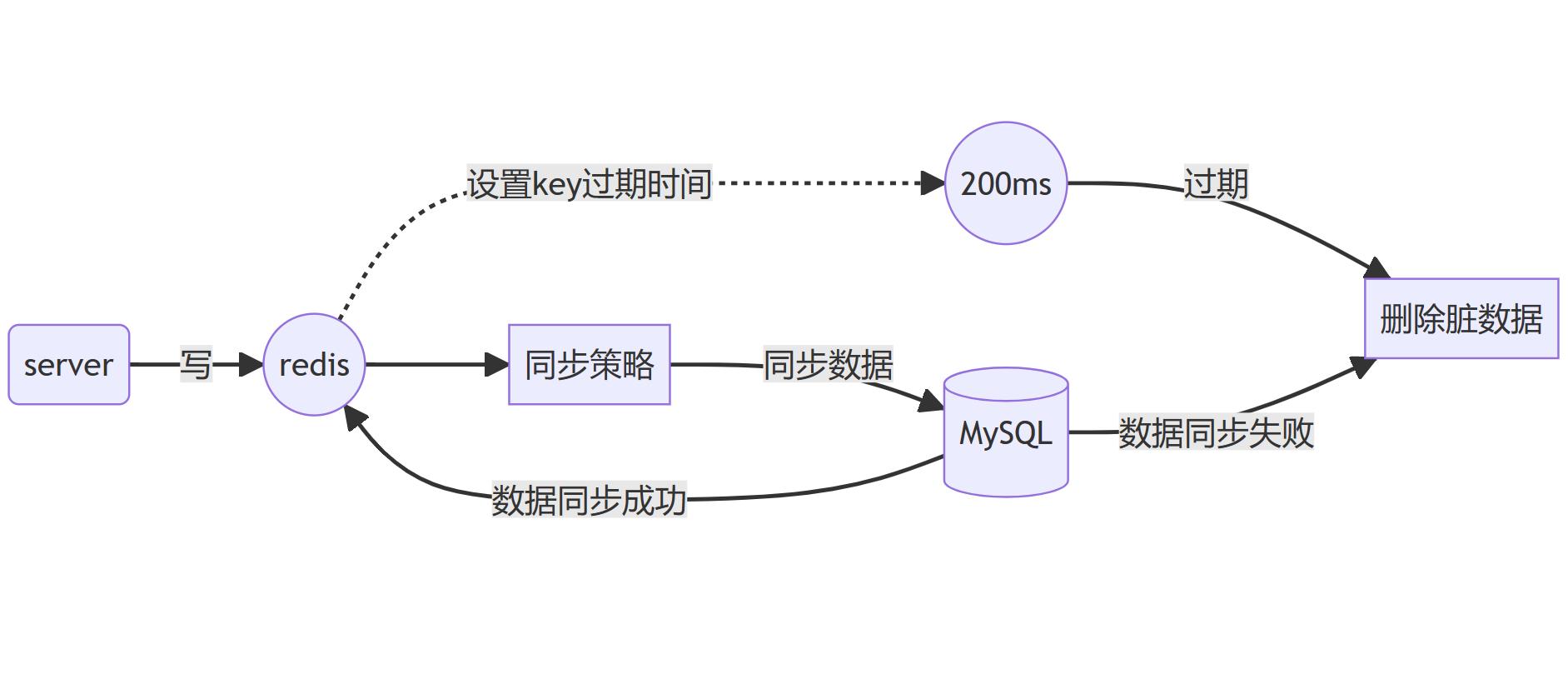 写策略:从效率优先方面考虑;先写缓存,并设置过期时间(如 200ms),再写mysql,后面数据同步交由其他中间件处理。