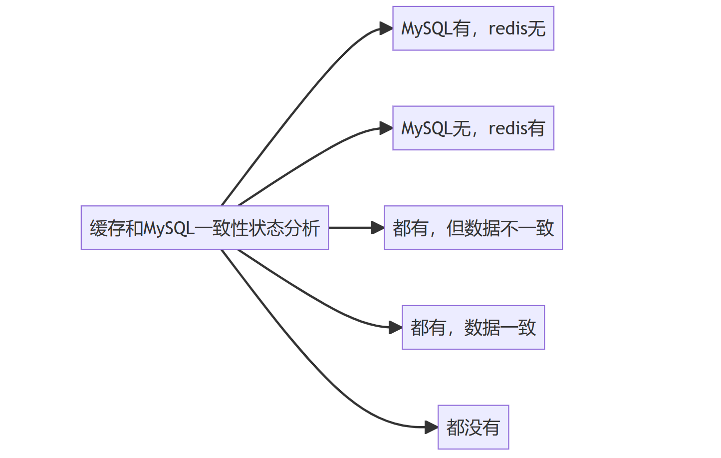引入缓冲层后,对数据的获取需要分别操作缓存数据库和mysql,那么这个时候数据可能存在以下状态: