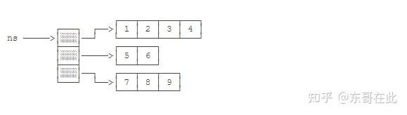 因为ns包含3个数组,因此,ns.length为3。实际上ns在内存中的结构如下: