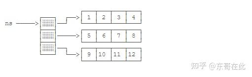 实际上arr0就获取了ns数组的第0个元素。因为ns数组的每个元素也是一个数组,因此,arr0指向的数组就是{ 1, 2, 3, 4 }。在内存中,结构如下:
