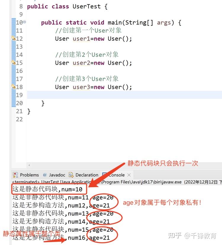 在上述代码中,我们创建了3个User对象。其中,无论构造几次对象,一个类中的一个static静态代码块都只会执行一次,所以在构造第一个User对象时num是10。然后执行非静态代码块,num变成11,age等于20。接着执行构造方法。num=12,age=21。