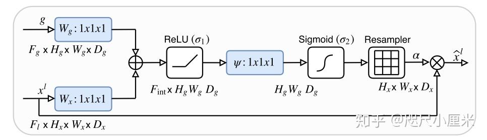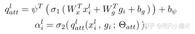 上图为加性注意力的公式,注意这里要结合结构来一起分析, \sigma_1 是Relu函数, \sigma_2 是Sigmoid函数, W_g、W_x、\psi 都是卷积操作, b_g、b_\psi 都是对应卷积的偏置项(所以发现 W_x 无偏置)。 F_{int} 一般比 F_g、F_l 要小。