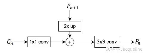 (2) 然后再将得到的特征和上一层采样得到特征图 P_{n+1} 进行融合,就是直接相加,element-wise addition。因为每个stage输出的特征图之间是2倍的关系,所以上一层上采样得到的特征图的大小和本层的大小一样,就可以直接将对应元素相加 。