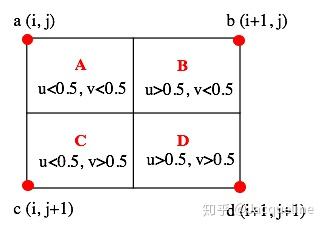 如果 (i+u, j+v) 落在A区域内,即 u<0.5, v<0.5 ,则将a点的像素值赋给待求像素,同理,落在B区则将b点的像素值赋给待求像素,落在C区则赋予c点的像素值,落在D区则赋予d点的像素值。最邻近法计算量较小,但可能会造成插值生成的图像灰度上的不连续,在灰度变化的地方可能出现明显的锯齿状。