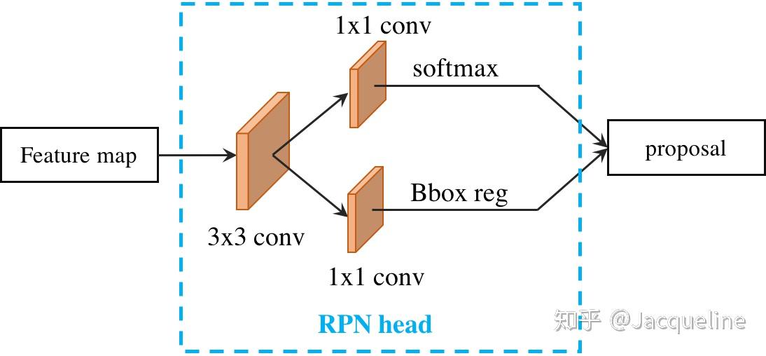 下图所示为Faster R-CNN中的RPN的网络结构,接收单尺度的特征输入,然后经过3*3的卷积,并在feature map上的每个点处生成9个anchor(3个尺寸,每种尺寸对应3个宽高比),之后再在两个分支并行的进行1*1卷积,分别用于对anchors进行分类和回归。这是单尺度的特征输入的RPN。