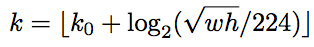 在Fast R-CNN 中有一个ROI Pooling层,它是使用region proposal的结果和特征图作为输入,得到的每个proposal对应的特征然后pooling,之后再分别用于分类结果和边框回归。之前Fast R-CNN使用的是单尺度的特征图,但是现在使用不同尺度的特征图,那么RoI需要在哪一个尺度的特征图上提取对应的特征呢? 作者认为,不同尺度的RoI应该使用不同特征层作为RoI pooling层的输入,大尺度RoI就用后面一些的金字塔层,比如P5;小尺度RoI就用前面一点的特征层,比如P4。那怎么判断RoI该用哪个层的输出呢?这里作者定义了一个计算公式:
