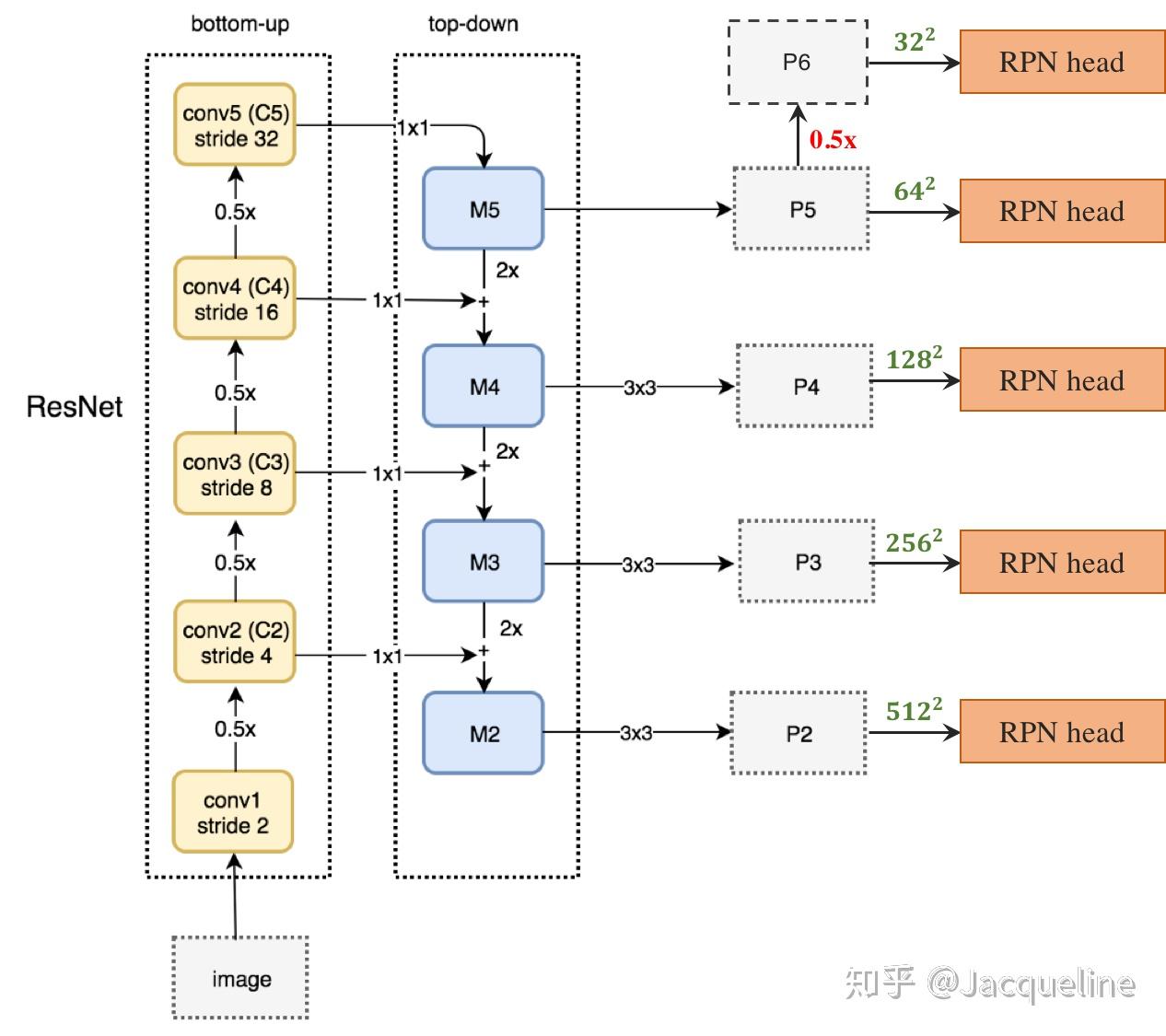 on {P2,P3,P4,P5,P6} respectively. 深层特征检测大目标,应该对应大的Anchor设计,不过作者画的图实在太好了,感谢。