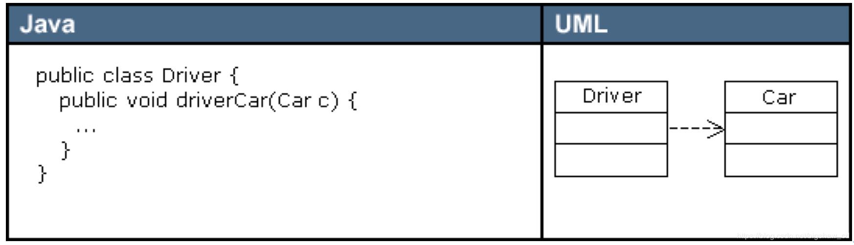 依赖(Dependency)关系是一种弱关联关系。如果对象A用到对象B,但是和B的关系不是太明显的时候,就可以把这种关系看作是依赖关系。如果对象A依赖于对象B,则 A “use a” B。比如驾驶员和汽车的关系,驾驶员使用汽车,二者之间就是依赖关系。