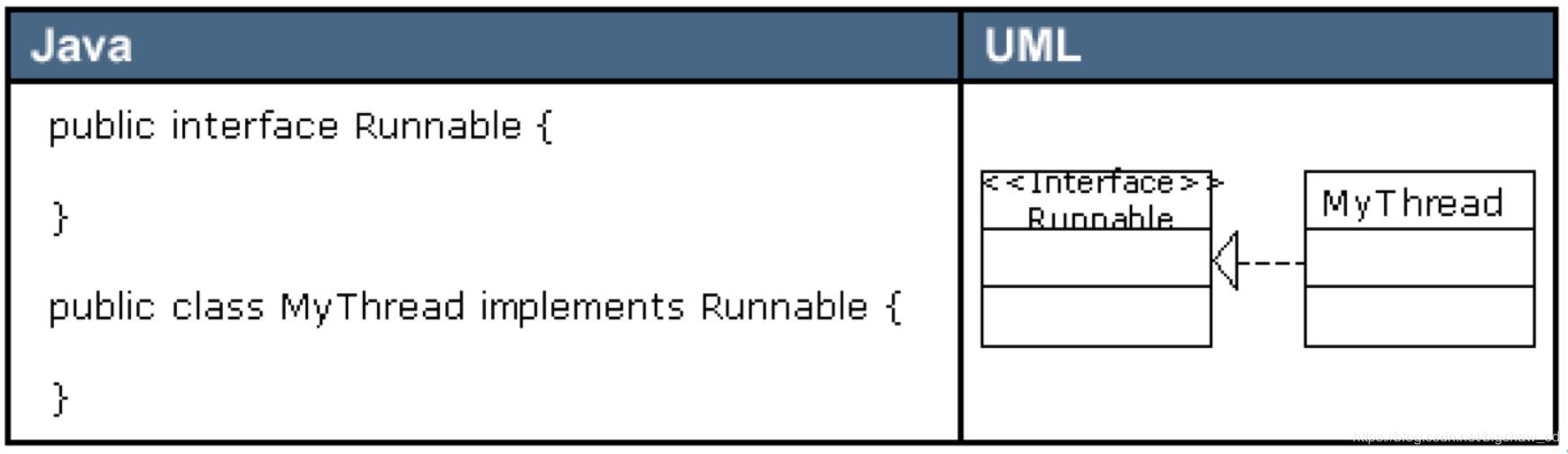 实现关系是指接口及其实现类之间的关系。在UML类图中,实现关系用空心三角和虚线组成的箭头来表示,从实现类指向接口,如图1.9所示。在Java代码中,实现关系可以直接翻译为关键字 implements。