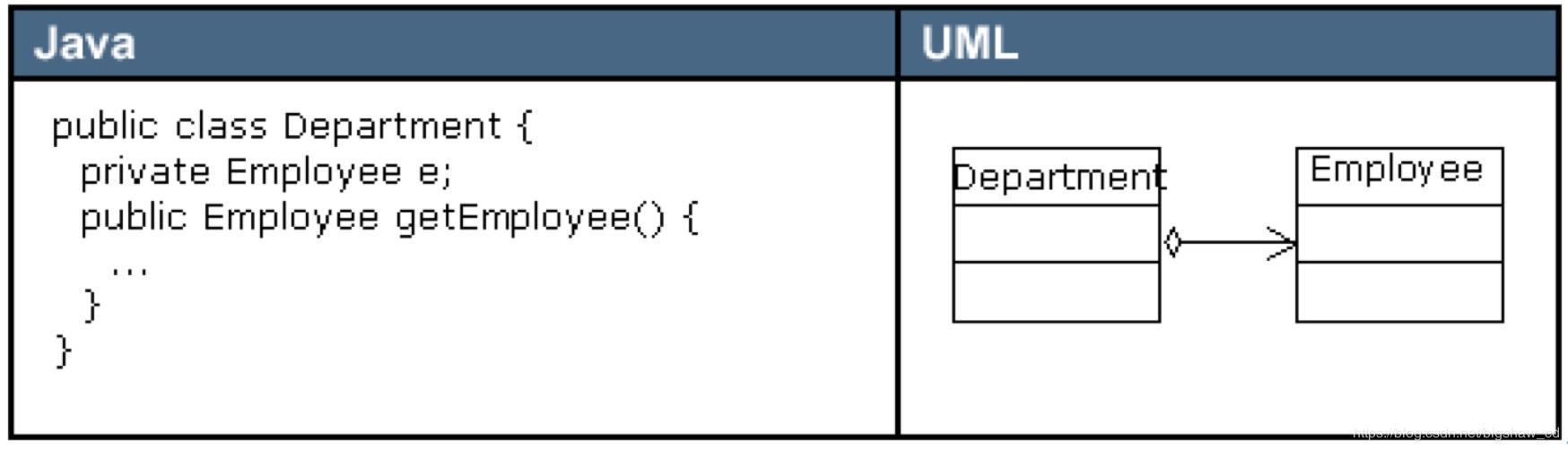 聚合(Aggregation)是关联关系的一种特例,它体现的是整体与部分的拥有关系,即 “has a” 的关系。此时整体与部分之间是可分离的,它们可以具有各自的生命周期,部分可以属于多个整体对象,也可以为多个整体对象共享,所以聚合关系也常称为共享关系。例如,公司部门与员工的关系,一个员工可以属于多个部门,一个部门撤消了,员工可以转到其它部门。
