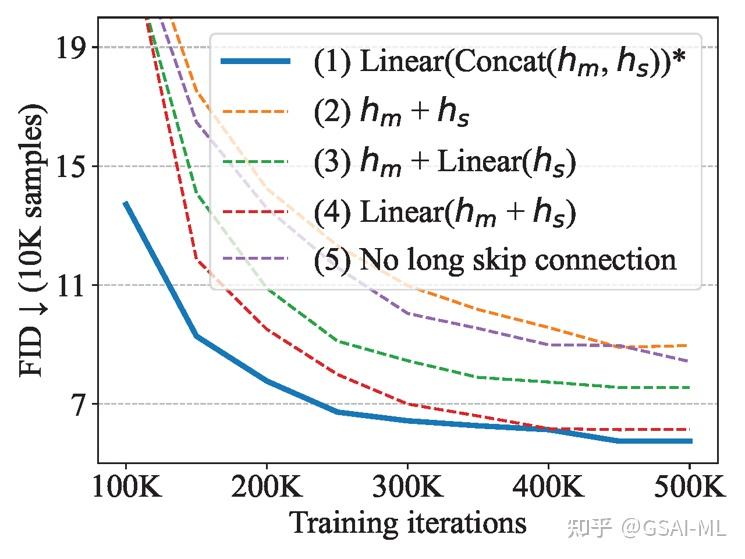 直观上理解,扩散概率模型中的噪声预测网络是像素级别的预测任务,对low-level feature敏感,long skip connection为连接low-level feature提供了快捷方式,所以有助于网络的训练。 对于网络主分支的特征h_m\in \mathbb{R}^{B,L,D}和来自long skip connection的特征 h_s \in \mathbb{R}^{B,L,D} ,其中B为batch_size,L为token 数目,D为每一个token的长度。作者探究了以下几种融合 h_m,h_s 的方式。  1. Linear(Concate([h_m, h_s],dim=-1))\\ 2. h_s + h_m\\ 3. h_m + Linear(h_s)\\ 4. Linear(h_s + h_m)\\ 5. No \ long \ skip \ connection