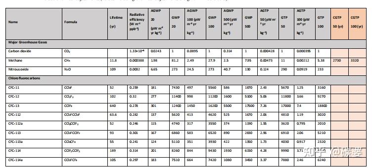 需要注意的是,GWP会随着时间改变,即使同一种气体在不同时间尺度上的GWP也是不同的,GWP以20年,100年,500年来衡量,IPCC提议用100年的GWP作为对照标准,最新值见IPCC 第六次评估报告 (AR6)-GWP值