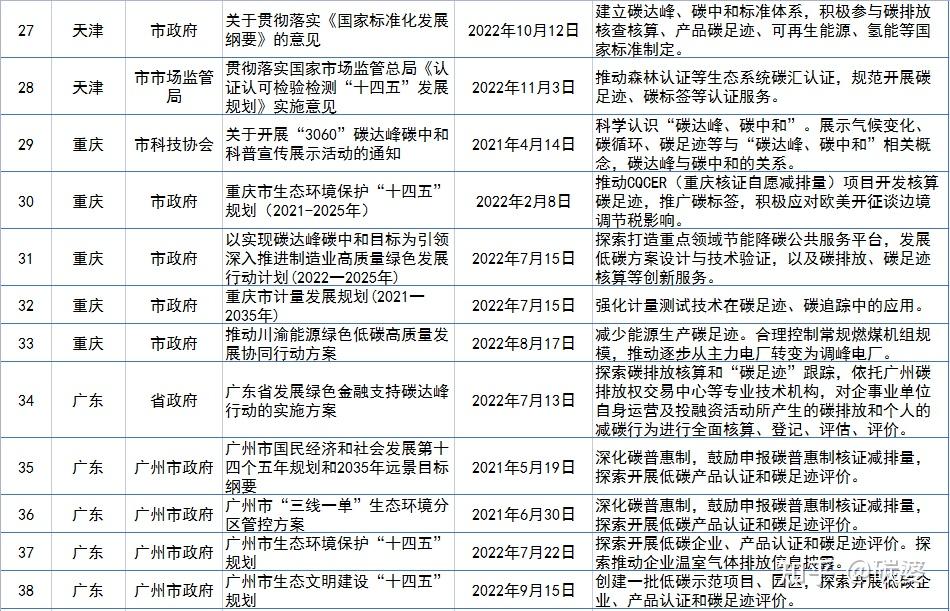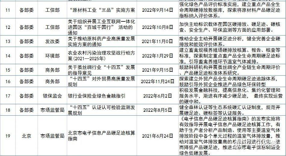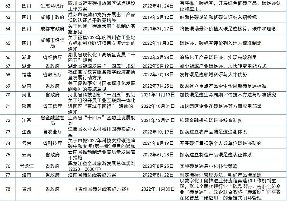 在不少重磅政策中,有不少提到了碳足迹要求,或建立标准或开展核算认证。中科碳中和ESG数字研究院投研团队,汇总了国务院、各部委及各省市的碳足迹相关政策,共79项,见下表。