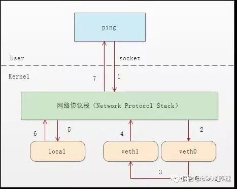 • 由于 ping 指定了走 veth0 口,如果是第一次,则需要发 ARP 请求,否则协议栈直接将数据包交给 veth0。